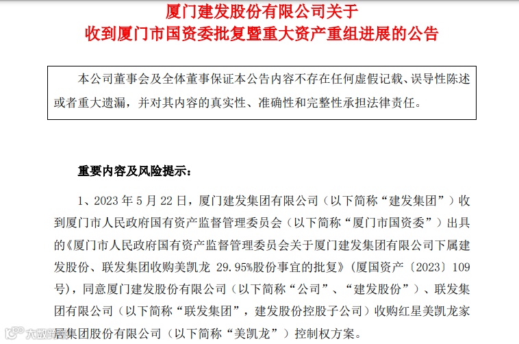 5月22日晚,建发集团、红星美凯龙分别发布公告称,建发集团收到厦门市国资委出具的《厦门市人民政府国有资产监督管理委员会关于厦门建发集团有限公司下属建发股份、联发集团收购美凯龙29.95%股份事宜的批复》(厦国资产〔2023〕109号),同意建发股份、联发集团收购美凯龙控制权方案。