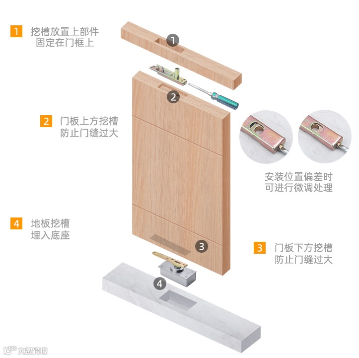 除了以上两种常用的,如果运用到旋转式的隐形门,那么会用到天地轴合页,安装及效果展示如下: