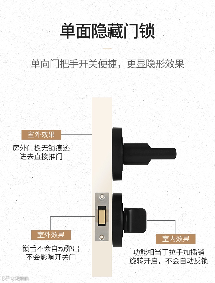 至于门锁,因为要达到外部隐藏的效果,一般采用单面隐藏门锁,如下示意。