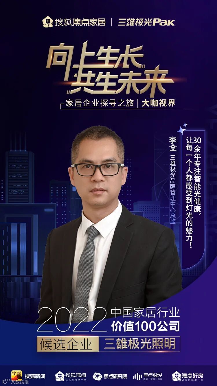 近日,由搜狐集团发起,搜狐焦点家居联合焦点研究院主办,“向上生长 共生未来——2022中国家居行业价值100公司”评选热烈进行中,为了深度挖掘企业硬核价值,探寻企业向上生命力,搜狐焦点家居年度特别策划《大咖视界》,本期对话三雄极光品牌管理中心总监——李全解读家居热点,共话家居趋势,助推行业高质量发展。