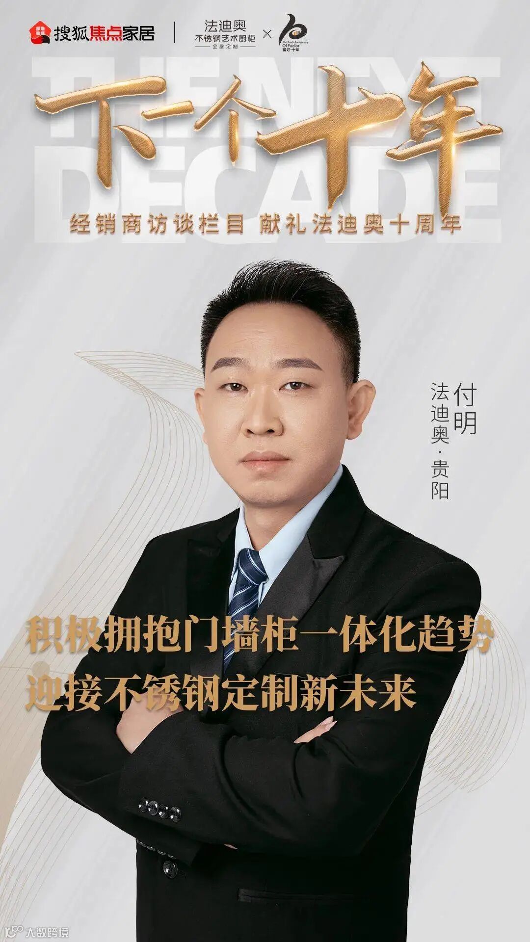 《下一个十年》法迪奥大商访谈第7期,对话法迪奥贵阳经销商付明,看定制行业高管如何从零开始创业,始终聚焦法迪奥不锈钢定制?如何以设计赋能营销,实现“拓荒者”到“领跑者”升级?又是如何十年不悔,紧跟法迪奥高速发展的步伐,成为千万级大商代表?