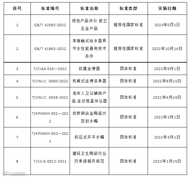 据不完全统计,2022年前三季度,卫浴行业新增8项标准,其中国家标准2项、团体标准6项。除《绿色产品评价 厨卫五金产品》于2023年5月实施外,其余7项标准目前已发布实施。