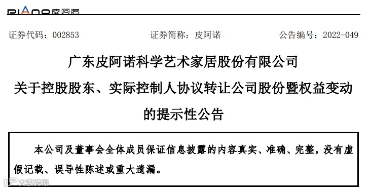 皮阿诺实控人马礼斌拟转让20%股份