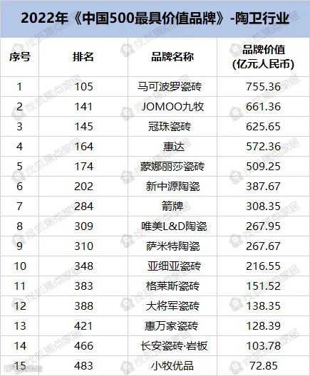 圣象以757.85亿元的品牌价值,位居2022年《中国500最具价值品牌》第100名;JOMOO九牧以661.36亿元的品牌价值,位居2022年《中国500最具价值品牌》第141名;三翼鸟以385.26亿元的品牌价值,位居2022年《中国500最具价值品牌》第209名;慕思以201.35亿元的品牌价值,位居2022年《中国500最具价值品牌》第371名。