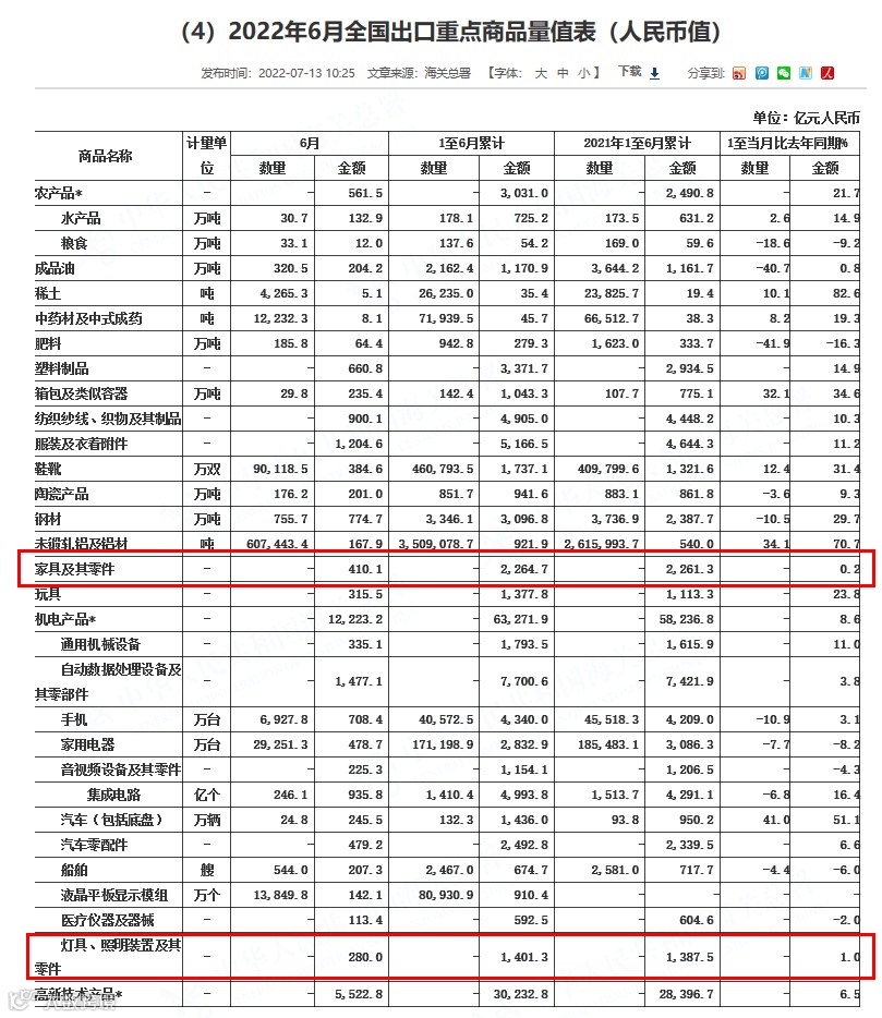近日,国家海关总署发布《2022年6月全国出口重点商品量值表》,数据显示,家具及其零件6月出口额为410.1亿元人民币,1-6月累计出口额2,264.7亿元人民币,同比增长0.2%;灯具、照明装置及其零件6月出口额为280亿元人民币,1-6月累计出口额1,401.3亿元人民币,同比增长1%。