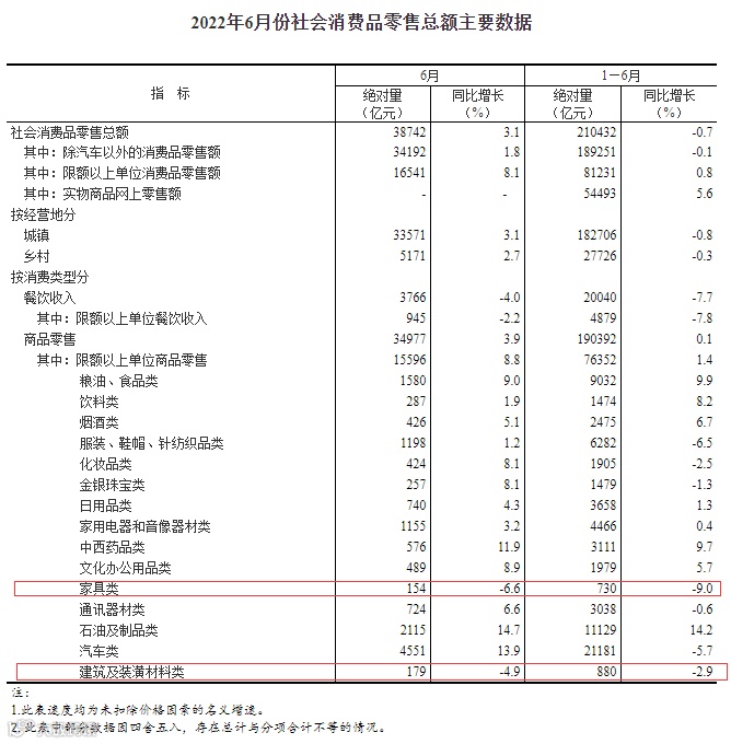 7月15日,国家统计局发布2022年1-6月国民经济运行情况。数据显示,2022年上半年,家具类零售总额为730亿元,同比下降9%;建筑及装潢材料类零售总额为880亿元,同比下降2.9%。其中,6月份,家具类零售总额为154亿元,同比下降6.6%;建筑及装潢材料类零售总额为179亿元,同比下降4.9%。