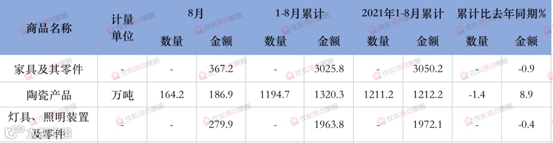 1-8月,中国家具及其零件累计出口额为3025.8亿元,同比下降0.9%;陶瓷产品出口金额为186.9亿元;陶瓷产品累计出口金额为1320.3亿元,同比增长8.9%;灯具、照明装置及其零件出口金额为279.9亿元。