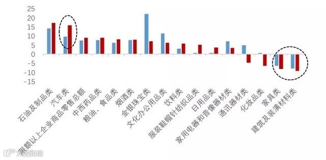在16类商品零售总额中,唯有通讯器材类、化妆品类、家具类、建筑及装潢材料类这4类同比下降,其中,家居类占其二,且数据垫底,分别位列倒一和倒二。