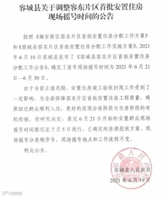 6月19日容城发布最新公告,雄安容东首批安置住房分配现场摇号时间由原定6月21日推迟到7月5日!