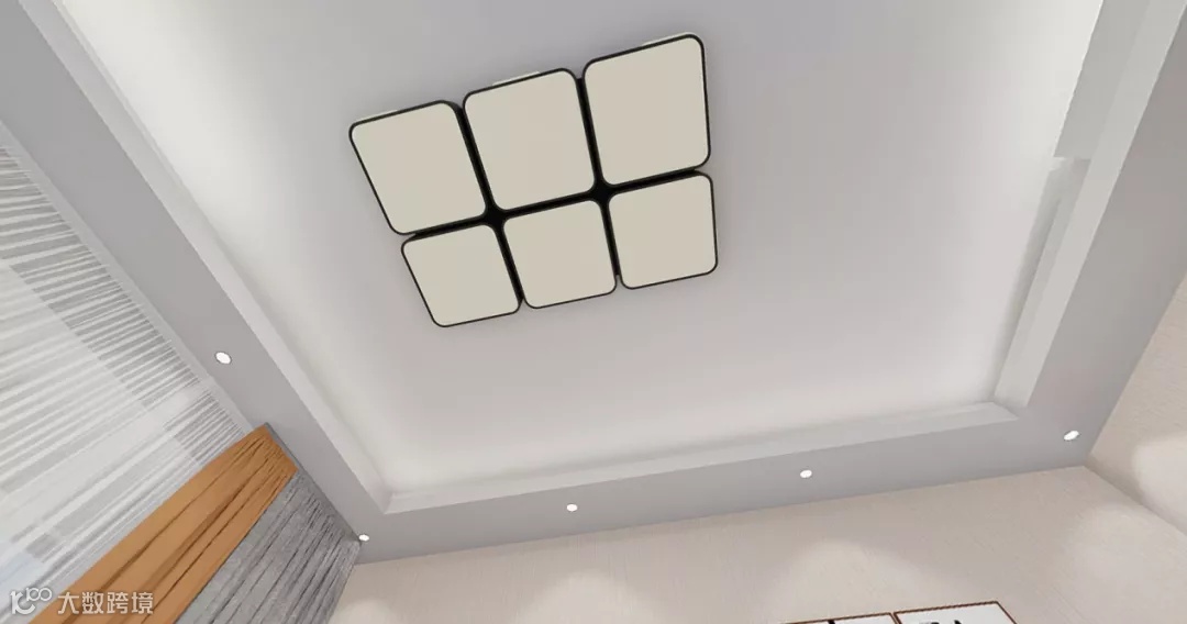 客厅的照明设计和餐厅类似,采用了方形环绕的点灯搭配,不同的是中心采用了长方形切成六块灯具的组合搭配,不仅满足了客厅晚上采光的需求,更让顶部空间呈现出别样的视觉感受。