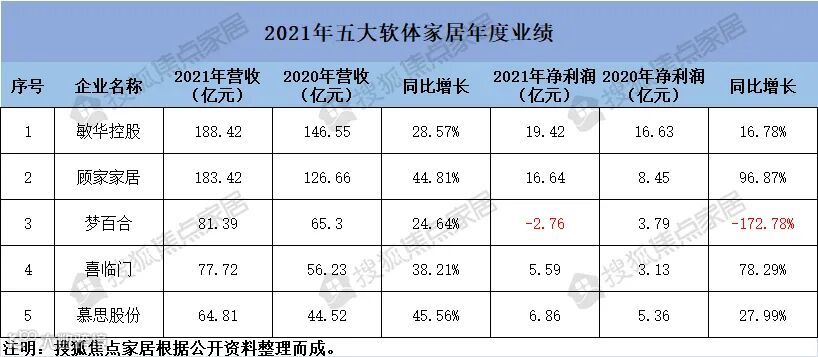 据搜狐焦点家居统计,五大软体家居巨头中,有四家实现了营收净利润的双增长,仅梦百合一家出现亏损。