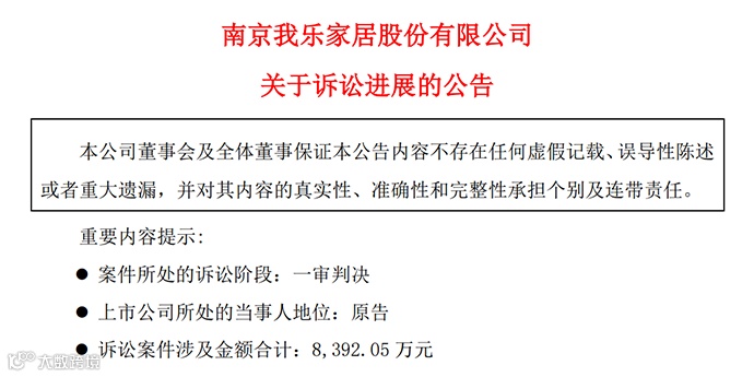 6月2日我乐家居发布公告,2022年5月30日收到法院一审判决,我乐家居及其全资子公司胜诉深圳恒大材料设备有限公司,深圳恒大材料设备有限公司应于判决发生法律效力之日起十日内支付电子商业承兑汇票金额共计7439.23万元及利息。