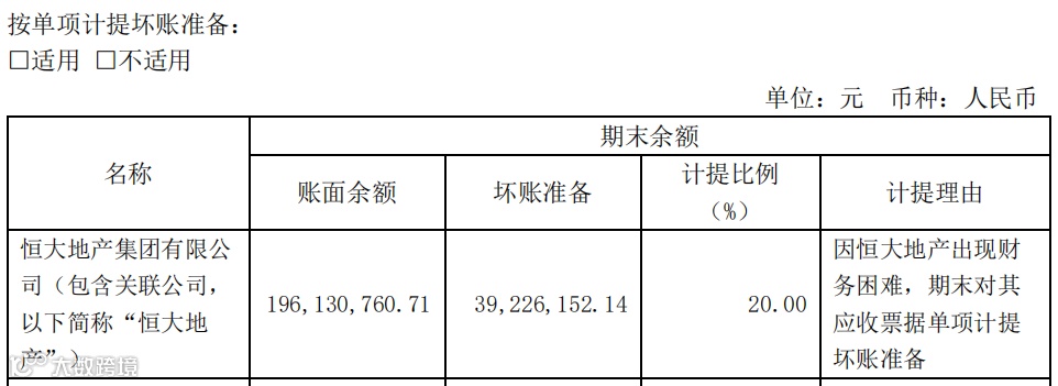 恒大自江山欧派成立起,就是其排名前三的大客户,根据江山欧派4月29日发布的2021年报显示,2017年1月-2021年12月,江山欧派与广州恒大发生销售额 21.40 亿元(含税)。而与恒大地产相关的账面余额为1.96亿元,计提坏账准备3922.62万元。