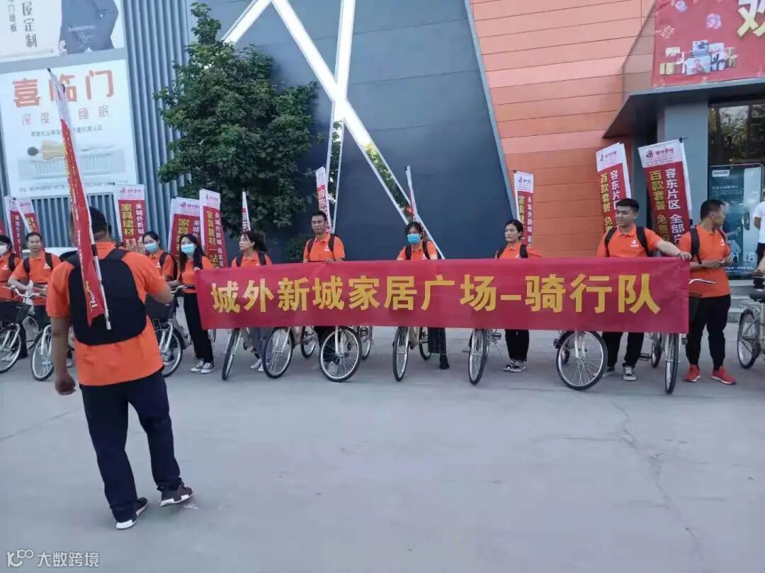 这支送福利的骑士团名为“城外新城家居广场-骑行队”,一身橙色战袍,一辆崭新单车,背着随风而动的战旗,标语为“容东片区、全部户型、百款套餐、免费设计”,所到之处,回头率100%!
