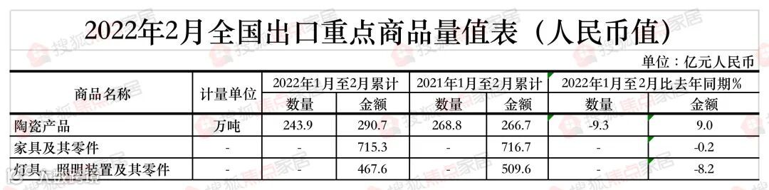 3月7日,中国海关总署发布2022年1-2月进出口情况。数据显示,2022年1-2月:家具及其零件出口额为715.3亿元,同比下降0.2%;陶瓷产品出口额为290.7亿元,同比增长9%;灯具、照明装置及其零件出口额为467.6亿元,同比下降8.2%。