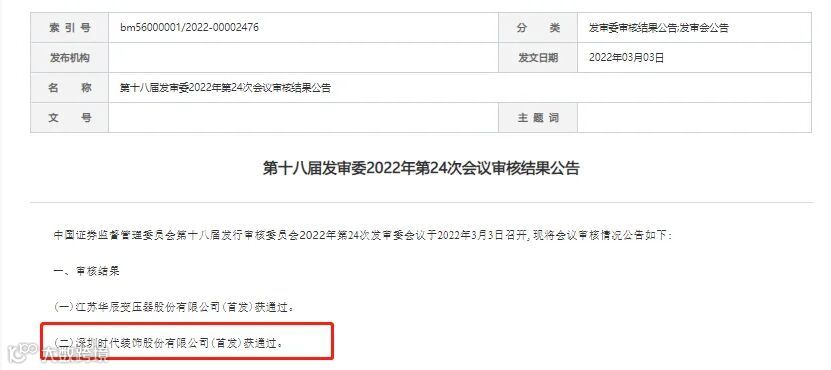 3月7日消息,时代装饰首发获通过。这是该公司时隔四年后二度冲击IPO,目标依旧是在深交所主板上市,保荐机构由开源证券换成了招商证券。