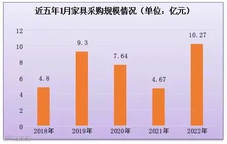 政府采购信息网据正福易找标大数据不完全统计,从近五年全国通过公开招标、竞争性谈判和询价等方式完成家具采购额情况来看,2018年1月全国家具采购额4.8亿元、2019年1月全国家具采购额9.3亿元、2020年1月全国家具采购额7.64亿元、2021年1月全国家具采购额4.67亿元,2022年1月全国家具采购额10.27亿元,创近五年来历史新高。