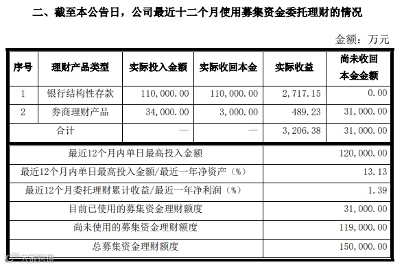 搜狐焦点家居获悉,截止2022年2月8日,公牛集团最近十二个月使用募集资金委托理财的情况为:1、银行结构性存款,实际投入金额11亿元,已全部收回本金,实际收益为2717.15万元;2、券商理财产品,实际投入金额3.4亿元,收回本金3400万元,实际收益为489.23万元。