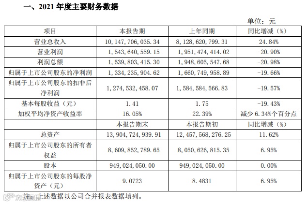 老板电器:2021年度公司实现营业收入10,147,706,035.34 元,同比增长 24.84%;实现归属于上市公司股东的净利润 1,334,235,904.62 元,同比下降 19.66%。