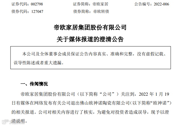 帝欧家居退出欧神诺?