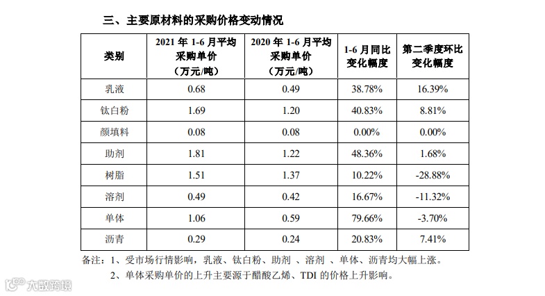 2021年1-6月,三棵树主要原材料的采购价格均出现不同程度的上涨,其中单体采购单价涨幅高达79.66%。这让三棵树的营业成本压力倍增。