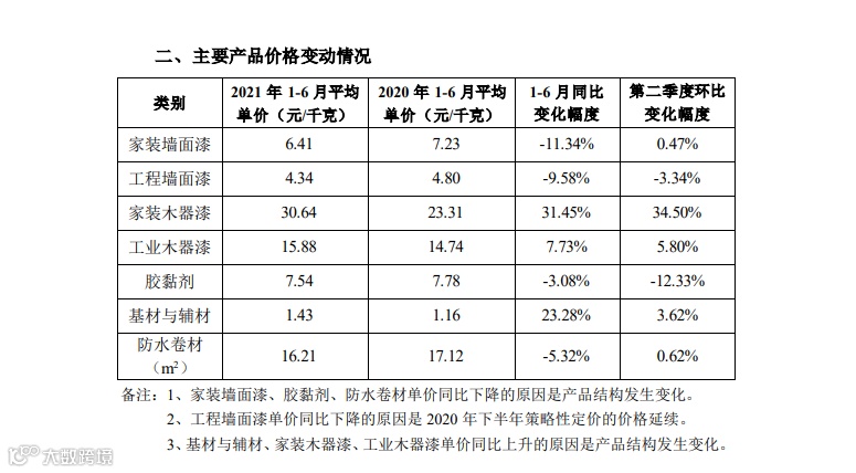 搜狐焦点家居整理相关资料发现,尽管原材料价格一路飙高,但三棵树却很长一段时间都选择按兵不动,直到今年3月才发布了第一轮涨价通知,而且根据三棵树1-6月主要经营数据报告显示,除了木器漆以及基材与辅料上调价格外,墙面漆、胶粘剂、防水卷材等反而同比下调了5%-11%不等,尤其是建筑墙面漆(家装+工程),合计下调了20.92%。