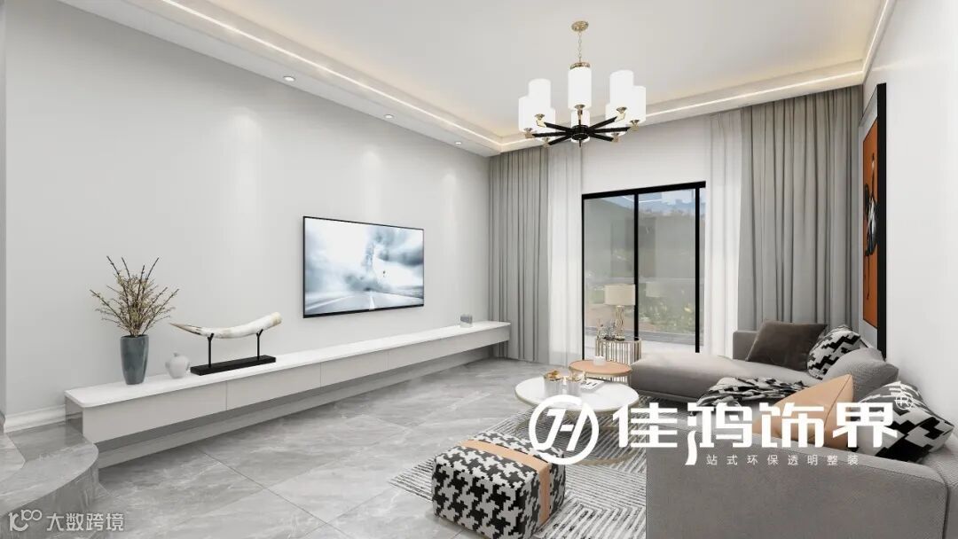 白灰色的整体空间具有不可比拟的高级质感。电视背景是一整面的乳胶漆,象牙白电视柜底部留空,使用哑光饰面,在上方吊灯+暗藏筒灯+灯带的多种照明方式映照下,生成亲切的视觉反馈。