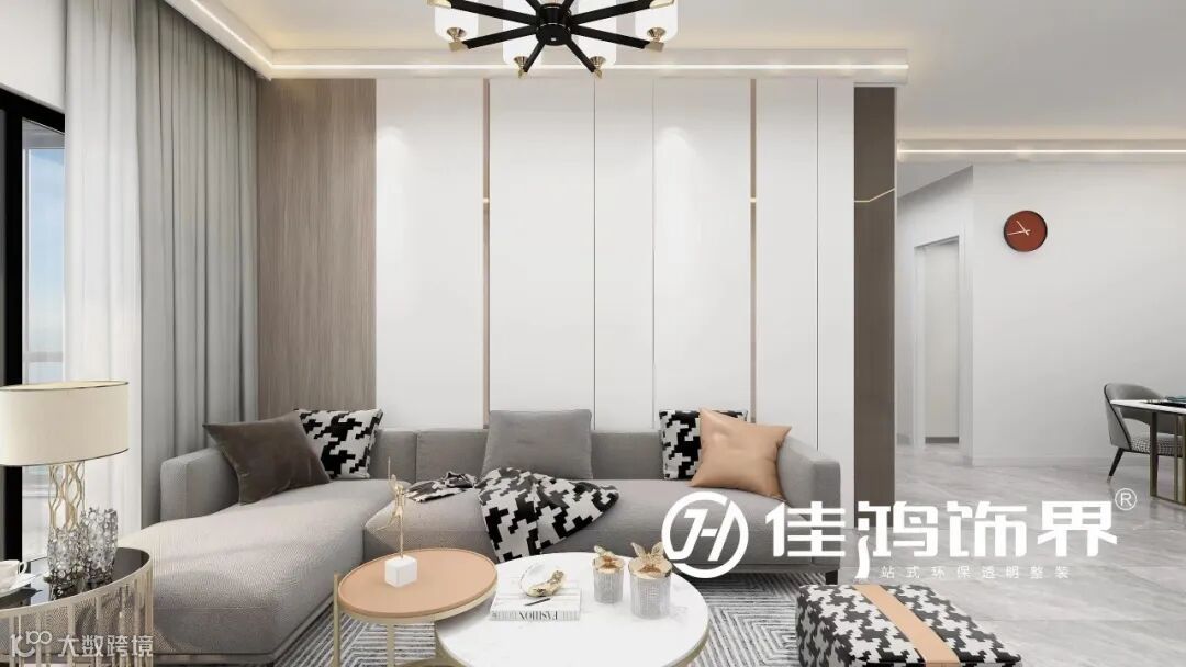 以简约线条的饰面板、灰色布艺沙发和轻巧的组合型茶几,将客厅的脉搏紧紧把控,聚焦轻奢的格调。