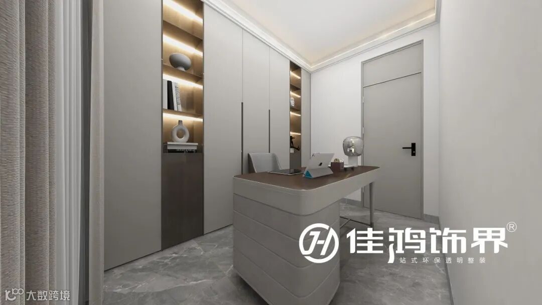 书房胡桃色桌面与灰色的单椅,营造出宁心静气的一隅,还有一整面的半开放式书柜,以内藏式灯带实现柜内照明和营造氛围感。