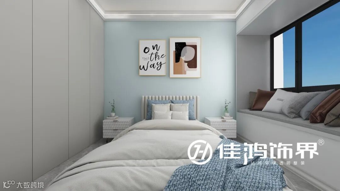 男孩房简洁浅蓝的墙面基础,ins风的条形床头和贝壳纹床头柜,搭配纯白与宝石蓝色的床单,衣柜把手隐藏式设计,守护孩子安全。简单大方的卧室空间,令人惬意轻松舒适。