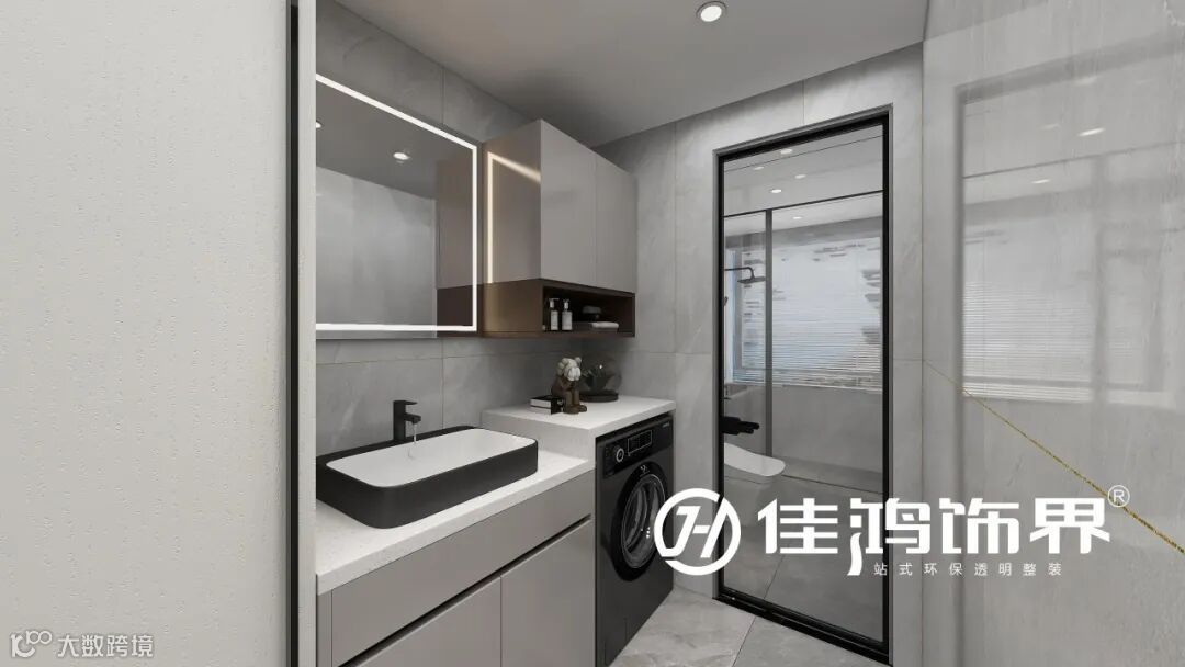 干区设置一体式的盥洗区和洗衣区,高低台面设计符合人体工程学,不累腰。方形LED梳妆镜和滚筒洗衣机的运用将智能电器带入家居生活。