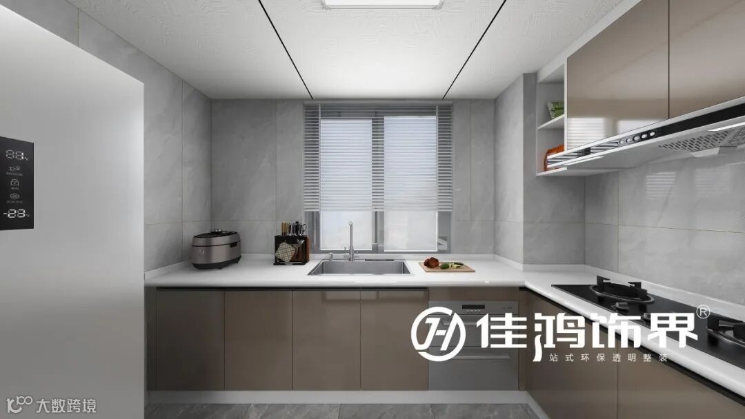 玻璃推拉门隔绝油烟,厨房墙面和橱柜设计风格沉稳时尚,采用了灰色+驼色的搭配,加上蜂窝板的吊顶, 营造出明亮清新的氛围。