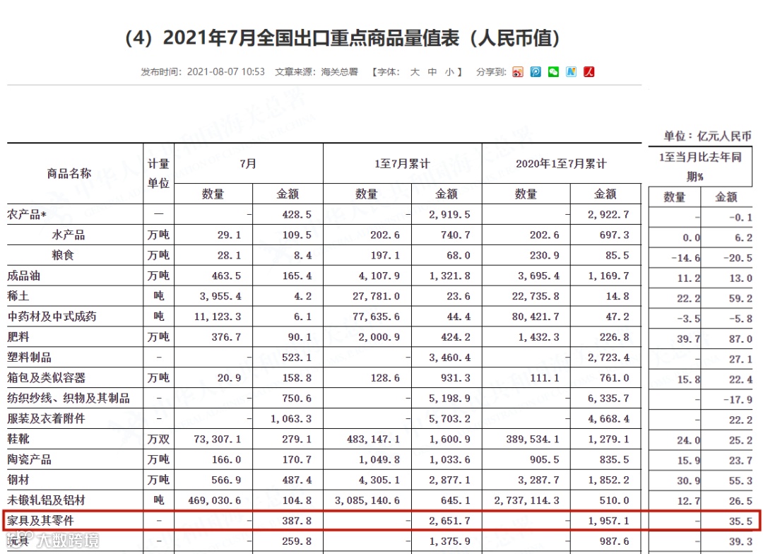 8月7日,据海关总署最新公布的数据显示,2021年7月,我国家具及其零件出口额为387.8亿元,1至7月出口总额为2651.7亿元,去年1至7月出口总额为1957.1亿元。今年1至7月出口总额比去年同期增长35.5%。