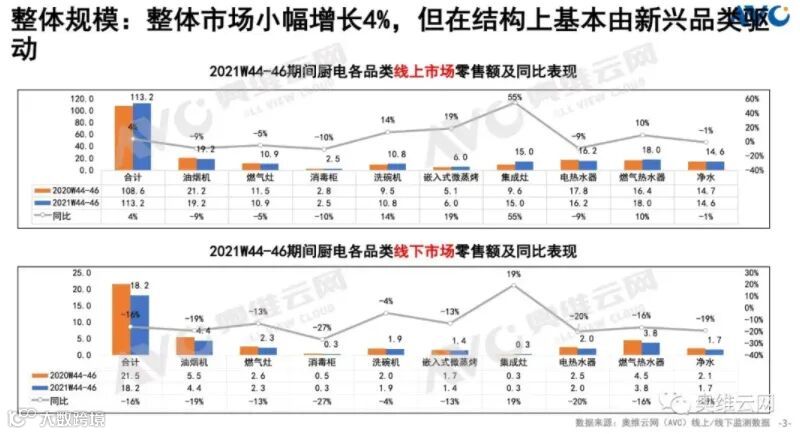2021年双十一促销季中厨电整体小幅增长4%,去年同期较高基数以及疫情常态化导致的消费环境乏力的背景下,厨电整体增长略显平淡,市场规模分品类增长呈现明显差异化其中,线上同比增长4%,线下同比下降16%。