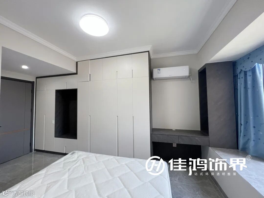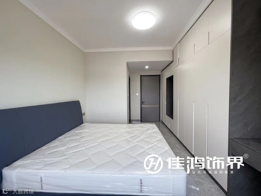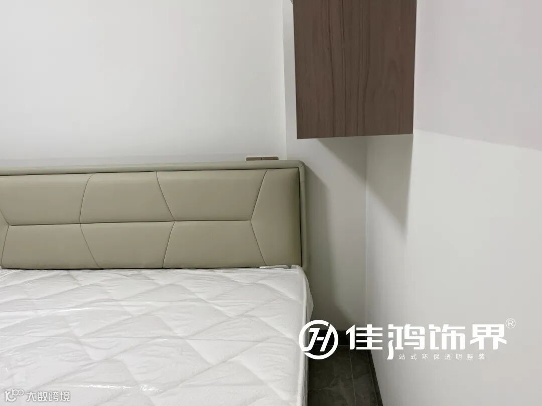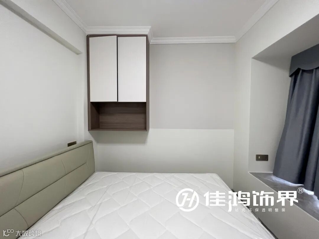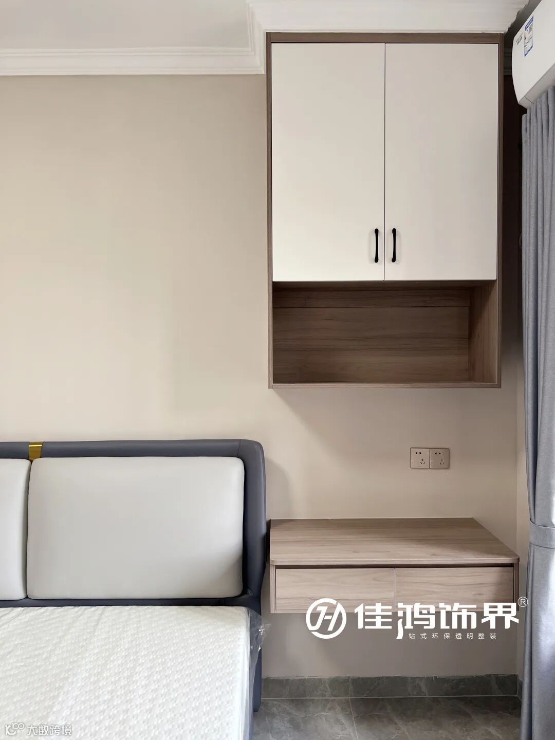 这一空间更从容,纯白背景墙,整体明亮统一。白色和木色相间的储物柜,抹茶绿床头,这些温馨舒适的元素,让放松成为卧室的主旨。