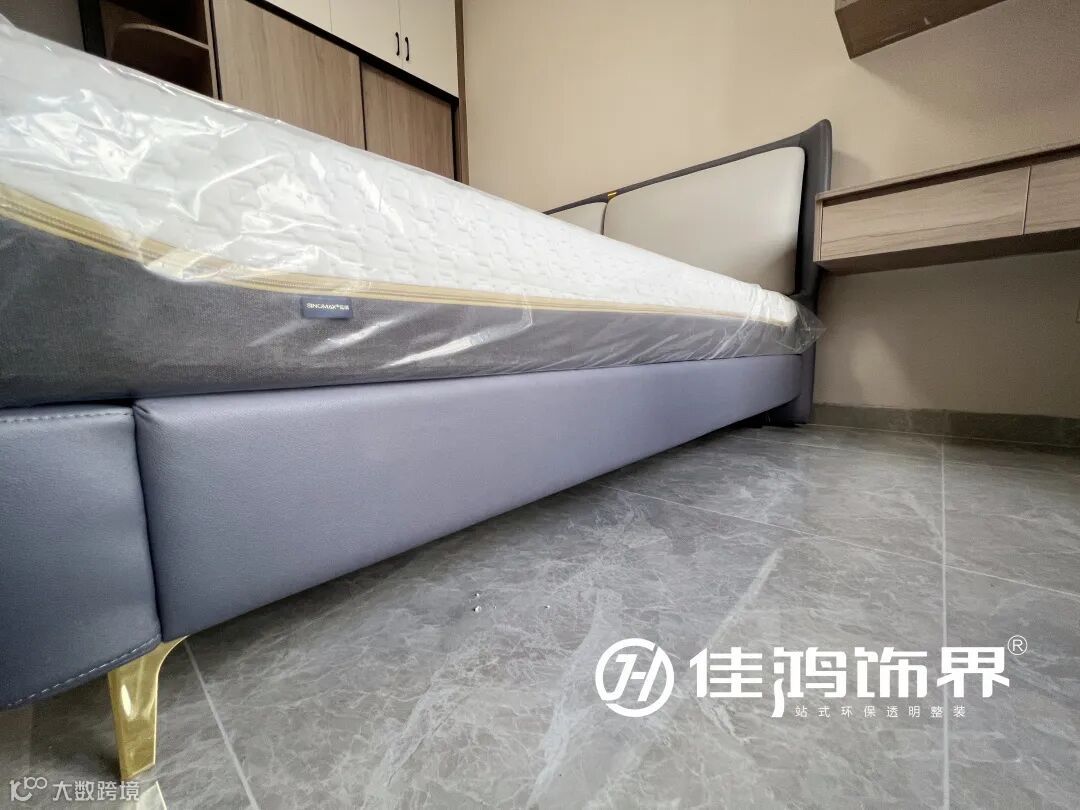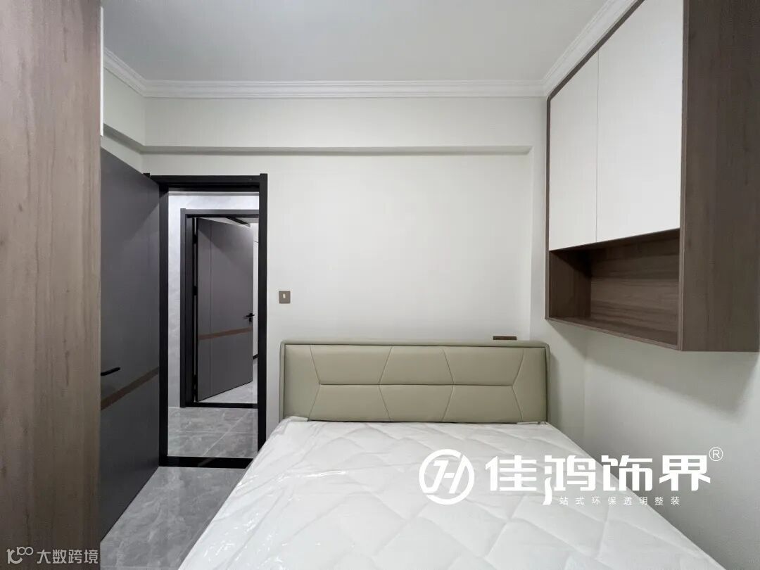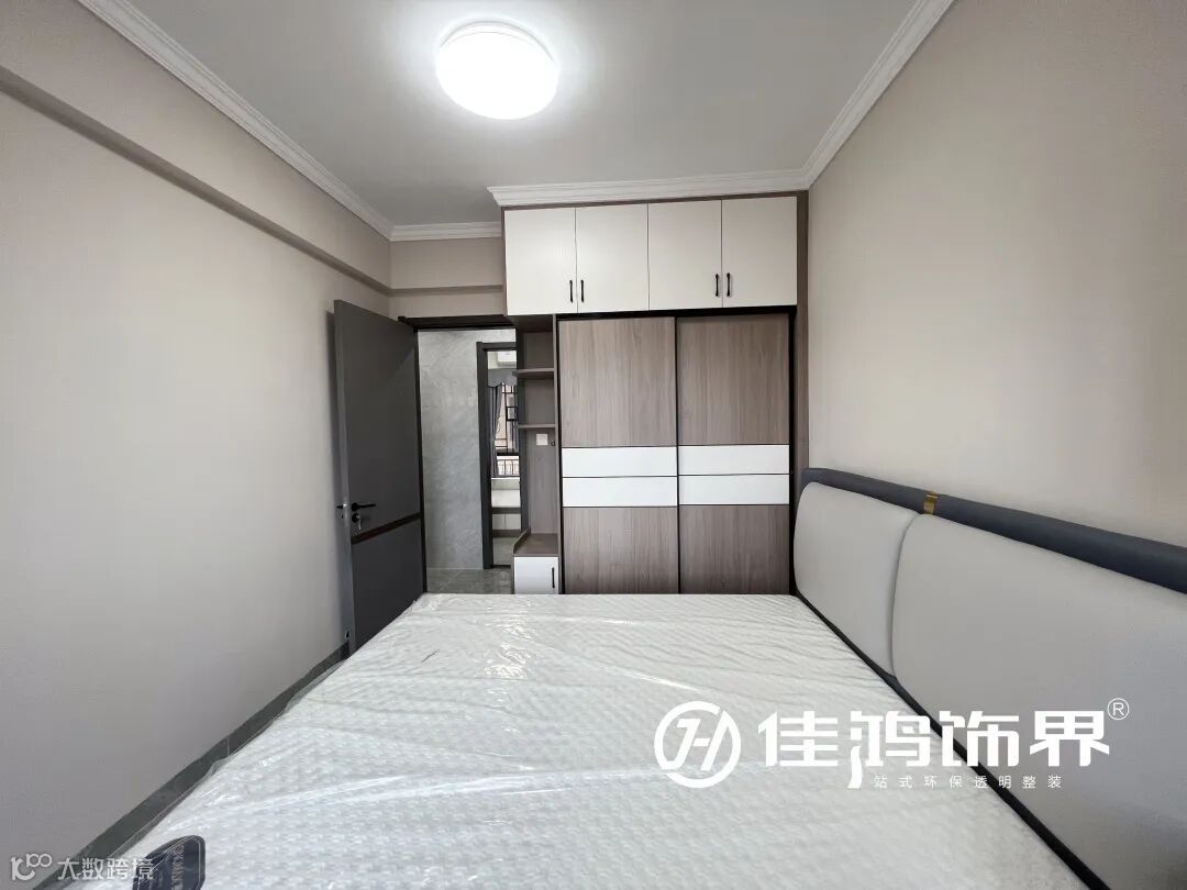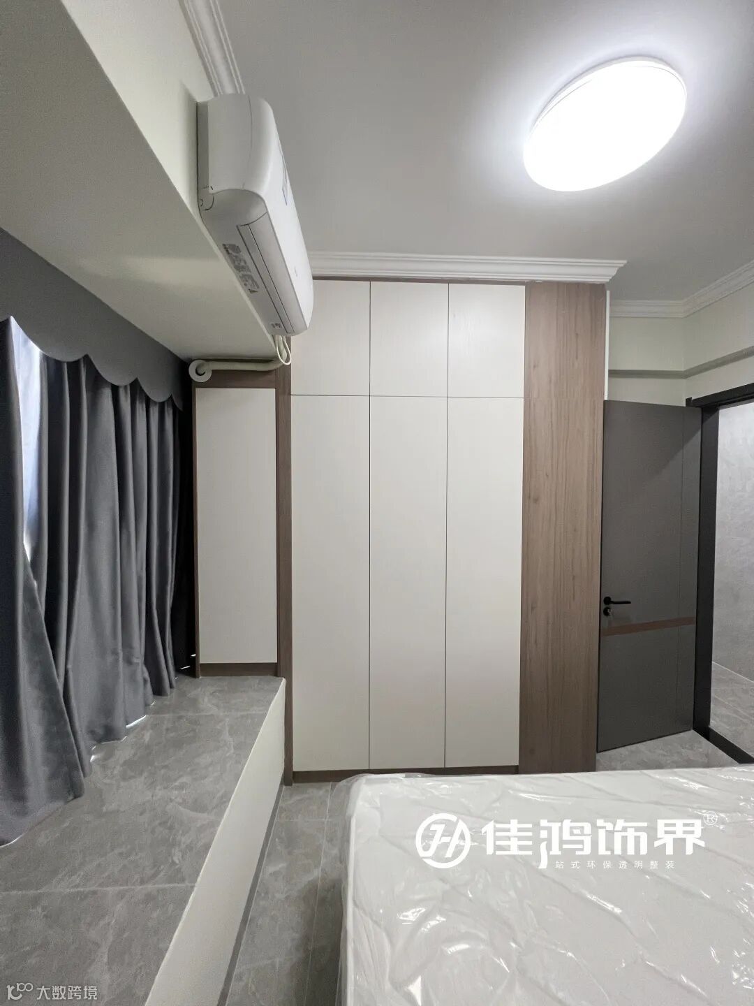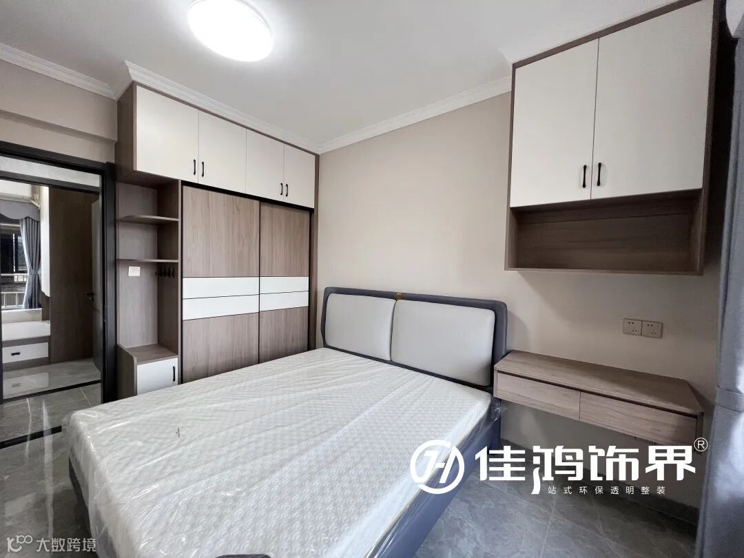 这一空间更从容,纯白背景墙,整体明亮统一。白色和木色相间的储物柜,抹茶绿床头,这些温馨舒适的元素,让放松成为卧室的主旨。