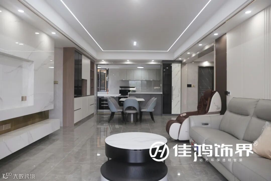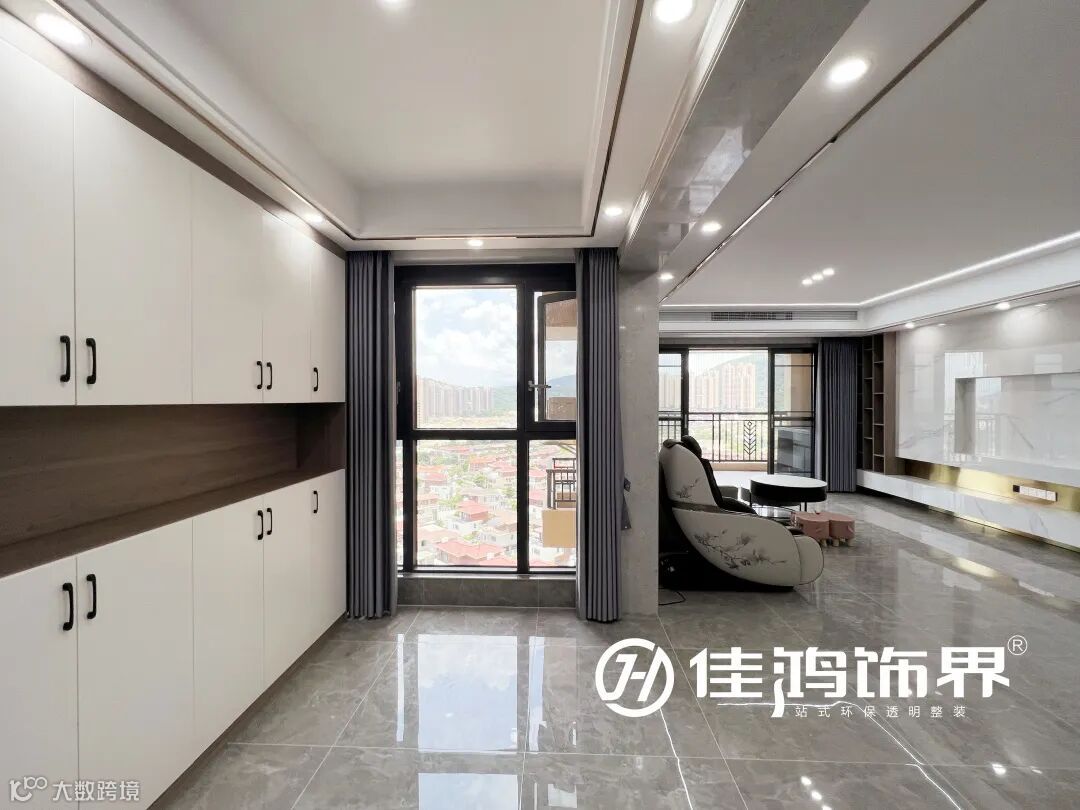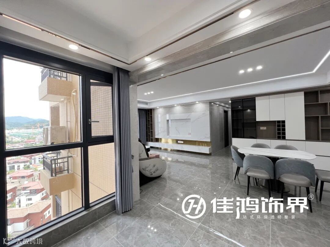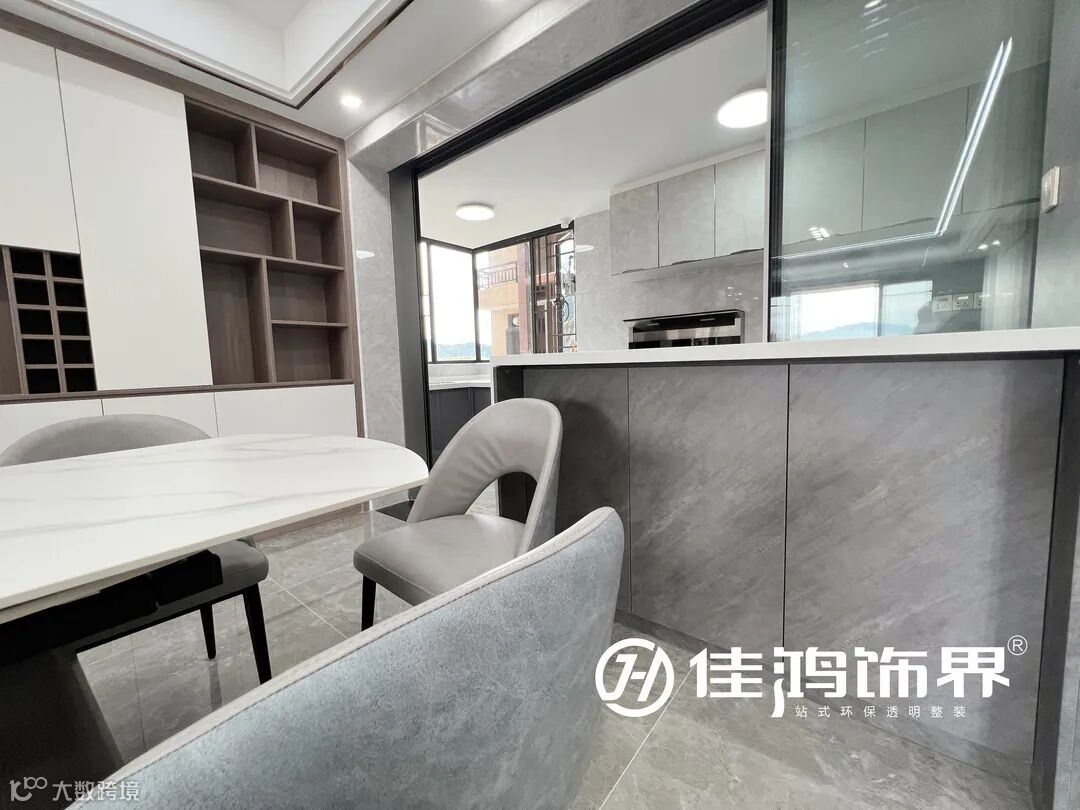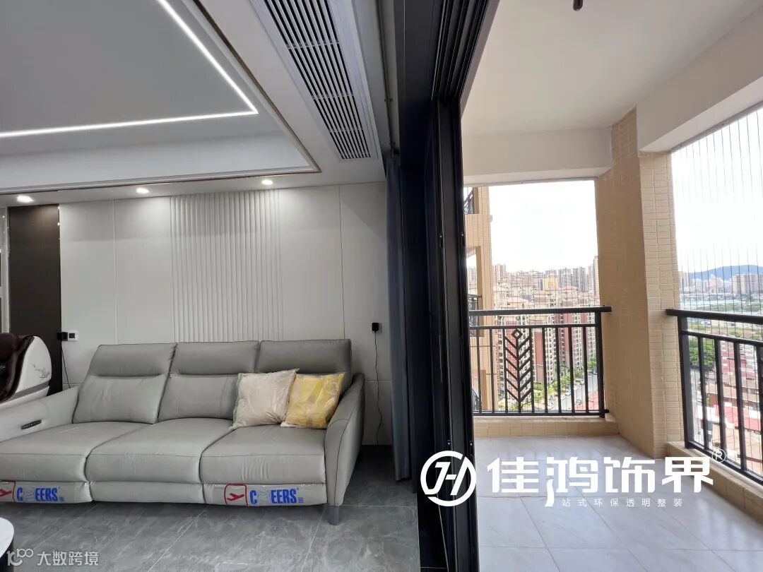 一侧做封窗处理,大面积的玻璃不影响采光,加上无隔断设计,从入户到客餐厅,风光一览无余,视觉上更通透。