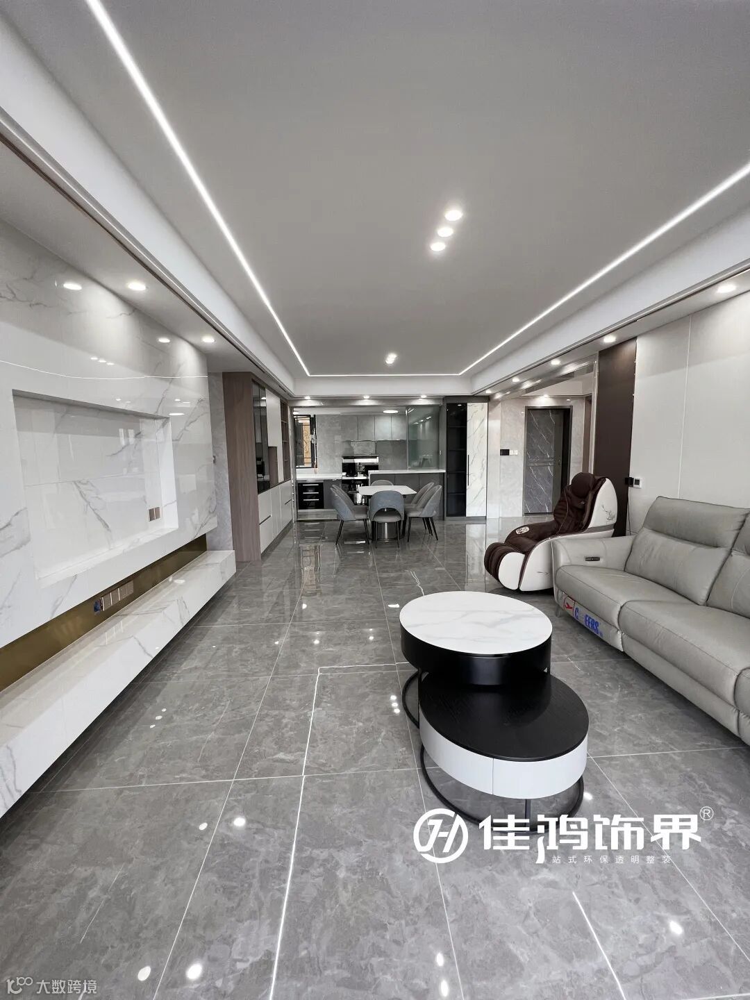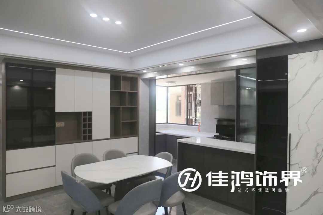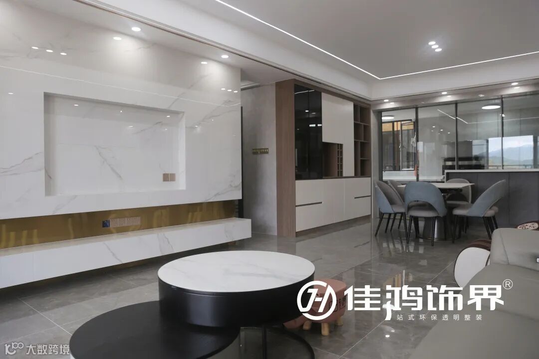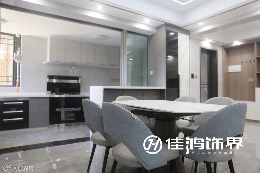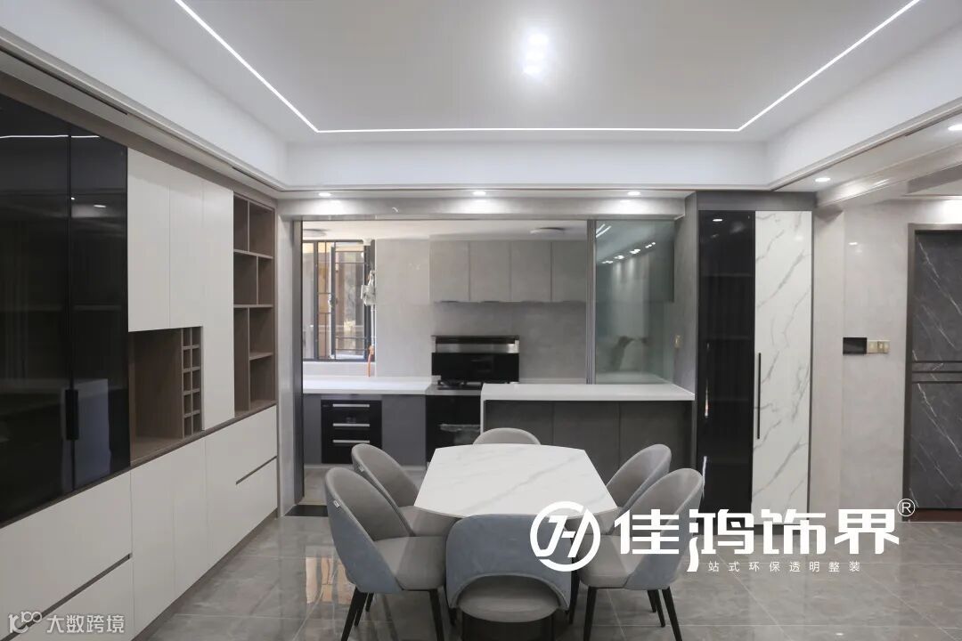 一侧做封窗处理,大面积的玻璃不影响采光,加上无隔断设计,从入户到客餐厅,风光一览无余,视觉上更通透。