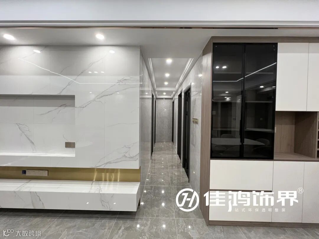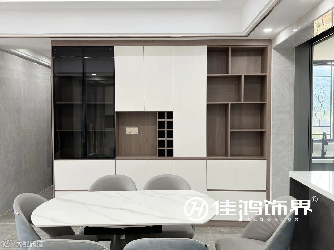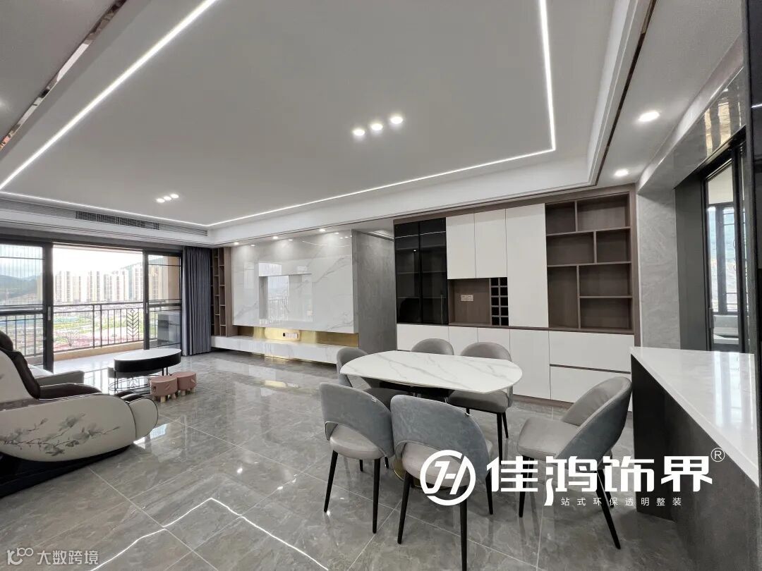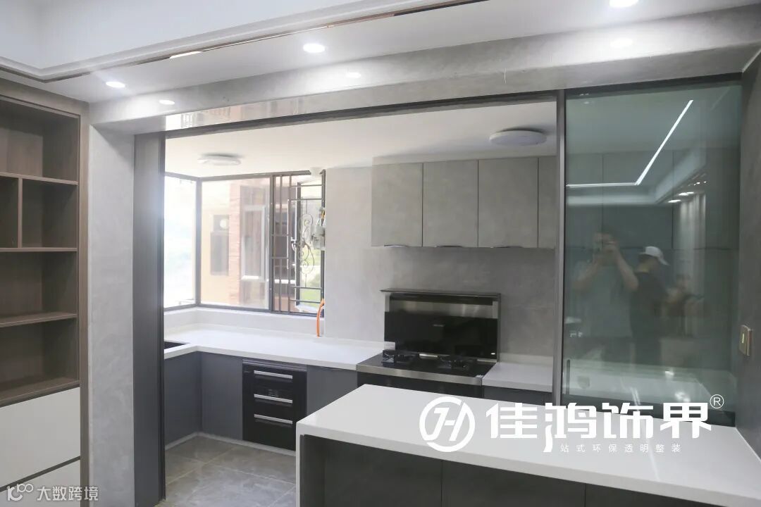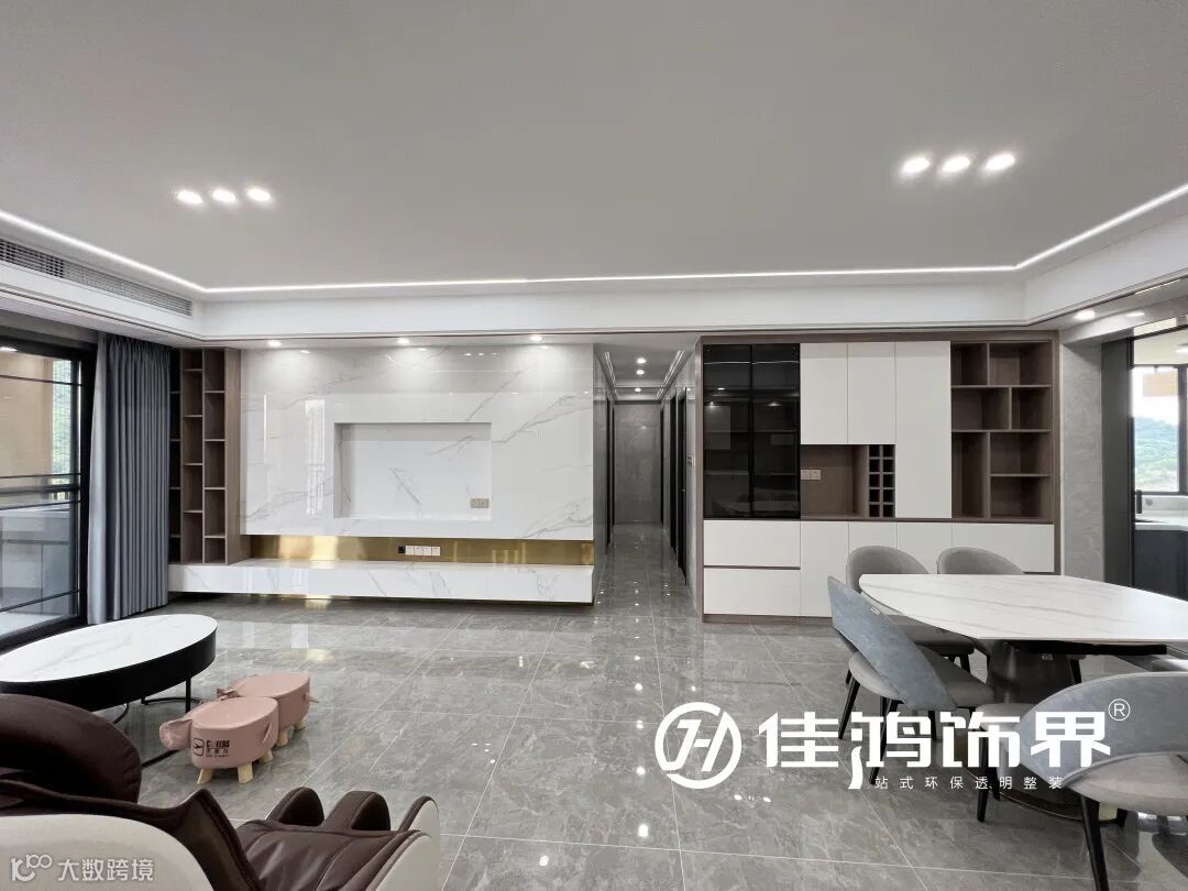 一侧做封窗处理,大面积的玻璃不影响采光,加上无隔断设计,从入户到客餐厅,风光一览无余,视觉上更通透。