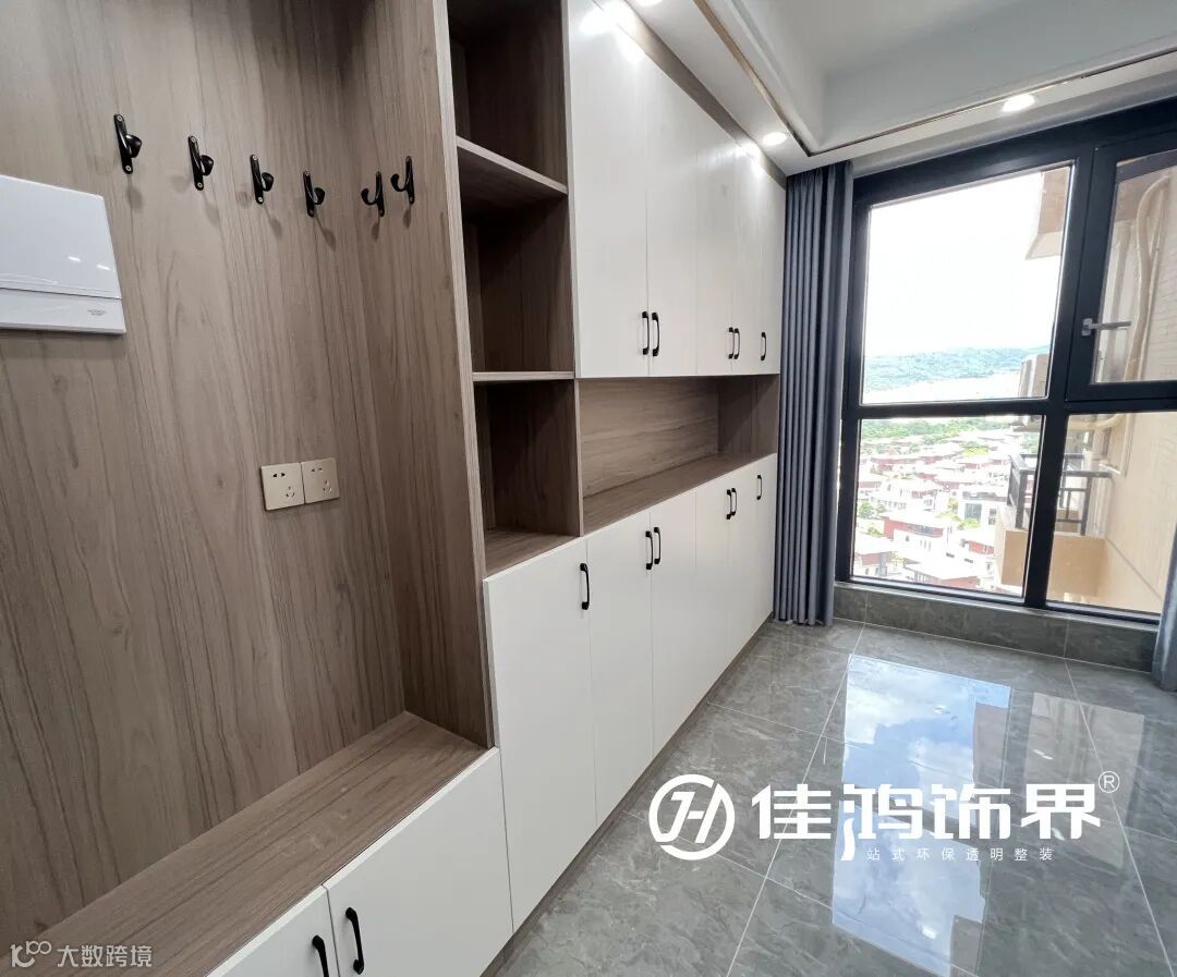 置物功能分为储藏式和悬挂式,灵活且便利。中部镂空以原木色打破单调视觉,可以放置花瓶、相框等增添入户的仪式感,底部放置回家要换的拖鞋。