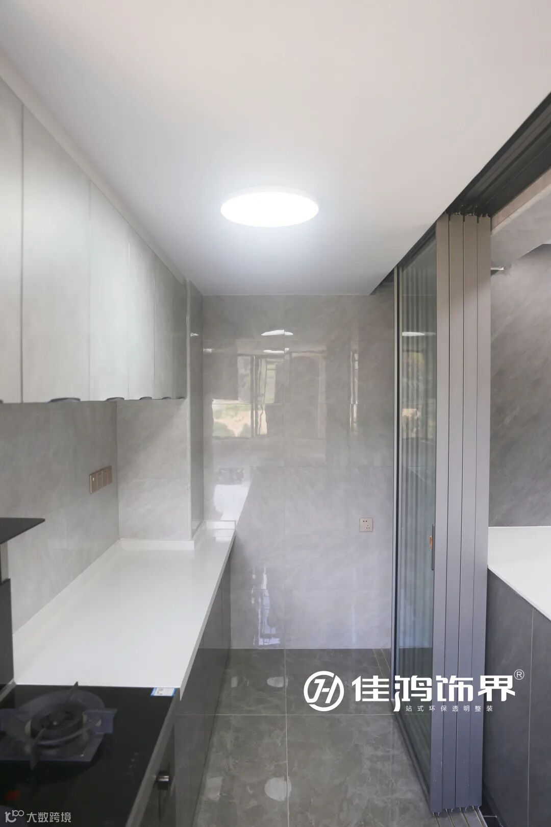 从灰色地砖、深蓝柜门过渡到白色台面,拉伸了空间层次感,使厨房显得更为开阔。