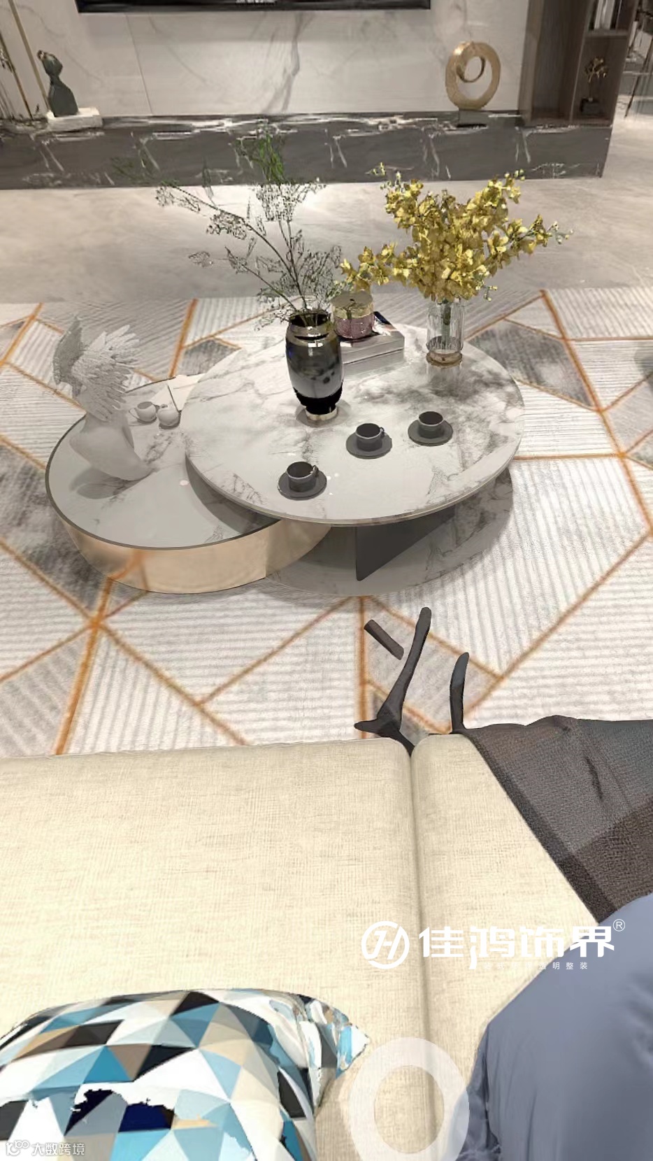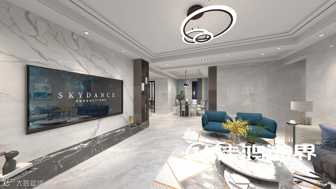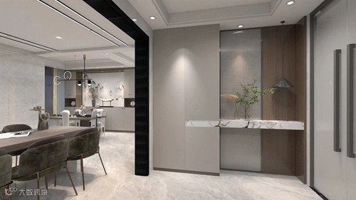 客厅沿用大量的大理石元素,传递出一种自然的治愈力和石材的独特感。富有层次的吊顶,配合通铺的灰纹地砖,简洁的硬装,使客厅显得格外开阔、温润。