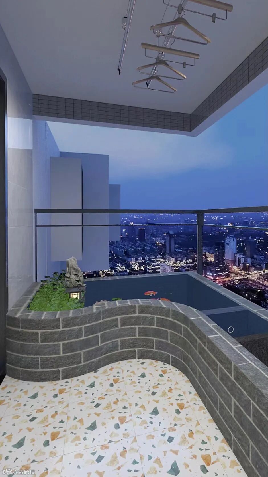 观景阳台是客厅向室外的延伸,以灰色小方砖和小鱼池打造休闲区,精致与休闲感并存,于此尽揽户外风光,颇有“闹中取静”、“忙里偷闲”之态。