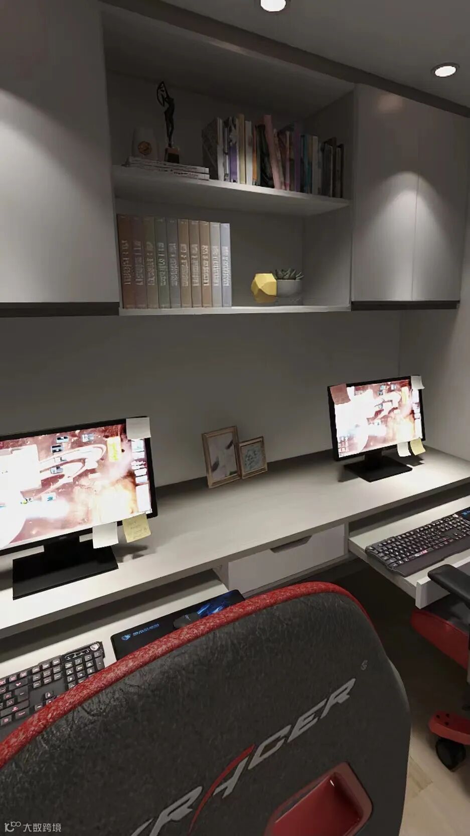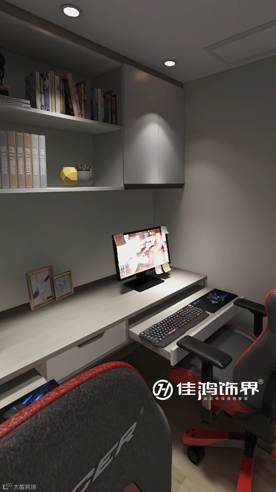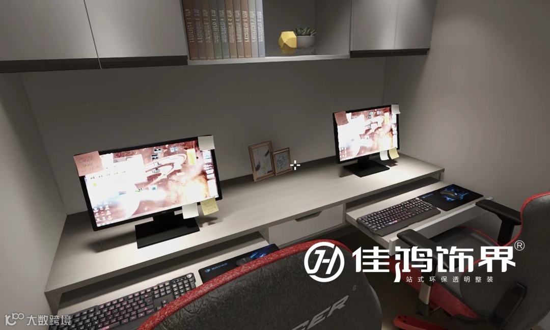 书房门藏匿于幕布旁,这里是属于两个人的小空间,不管是工作还是游戏,双人书桌都能让彼此成为最好的陪伴。
