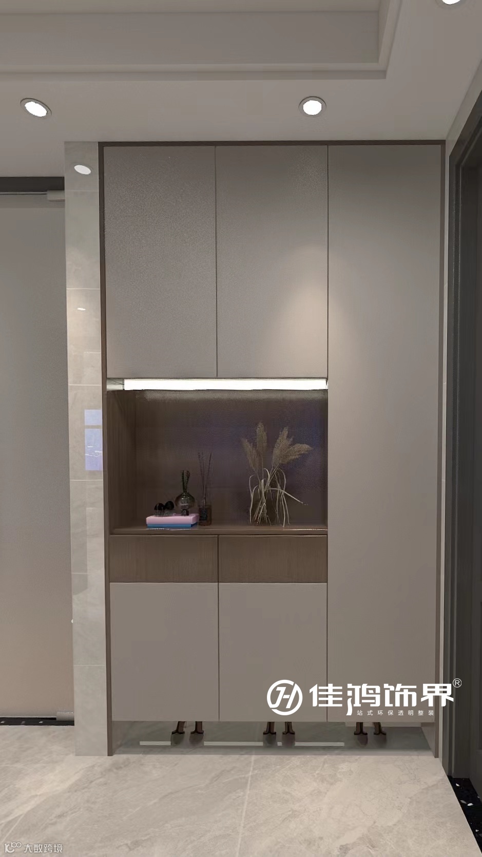 内嵌的玄柜严丝密缝,中部和底部留空,配合恰到好处的灯光,方便放置物品和更换鞋子。