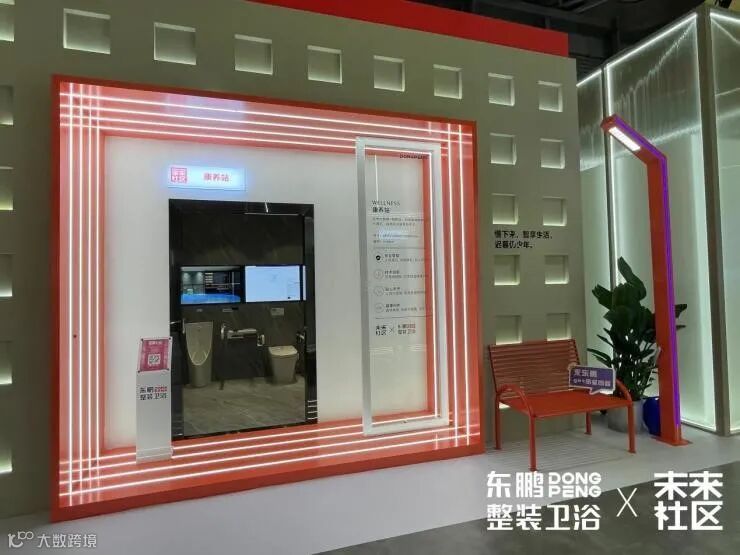 东鹏也在适老化产品方面也进行了创新探索,“康养站”的康养空间配备了人体感应地面和石墨烯热暖墙板。人体感应地面,可以记录着老人平时的起居、行动、行为习惯,感知老人行走状态和轨迹,发现异常将进行通知和报警,时刻守护家人安全。石墨烯热暖墙板,可以使浴室快速达到恒温效果,打造一个温暖舒适的浴室。