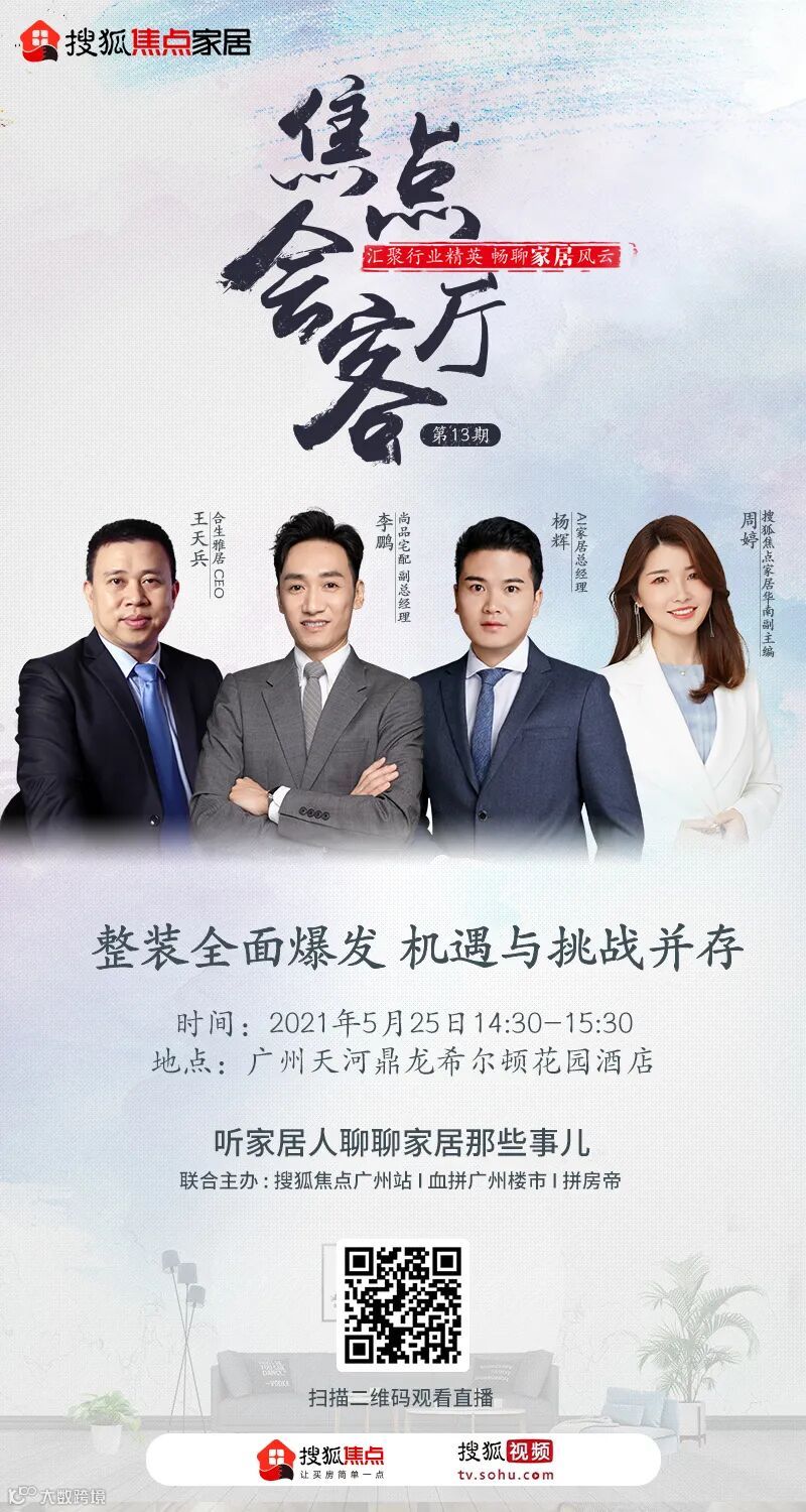 汇聚行业精英,畅聊家居风云!本期对话特别邀请到了尚品宅配副总经理李鹏、合生雅居CEO王天兵、AI家居总经理杨辉,三位代表不同整装入局模式,对话搜狐焦点家居华南副主编周婷,围绕整装的目的及意义,聚焦整装的发展与挑战,为解决消费者痛点而献计献策,为整装的良性发展贡献一份力量。