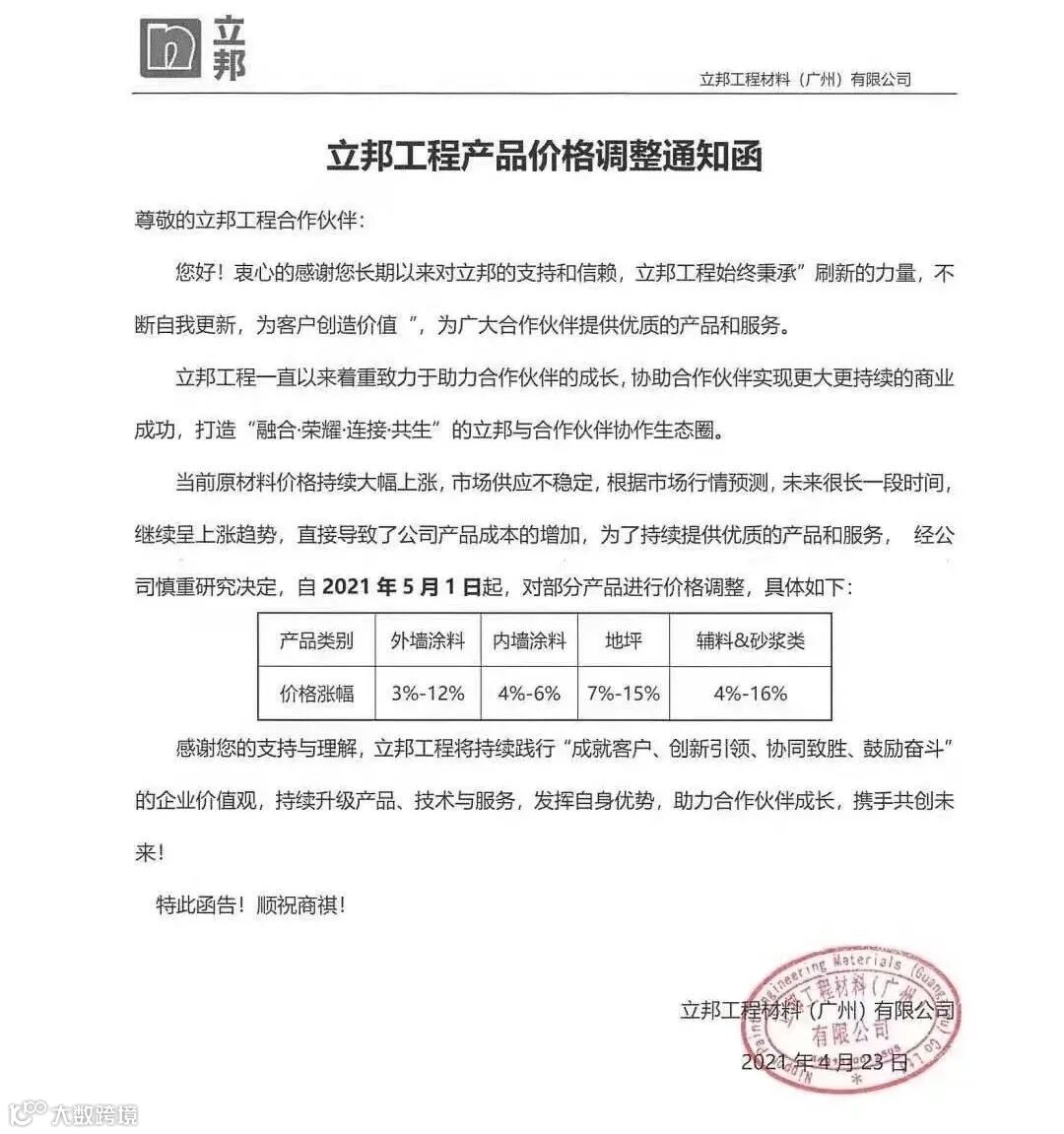 4月28日,立邦工程材料(广州)有限公司发布《立邦工程产品价格调整通知函》称,原材料价格的上涨,直接导致立邦工程公司产品成本增加,为了持续提供优质的产品和服务,经立邦工程公司慎重研究决定,自2021年5月1日起,对公司部分产品进行价格调整。