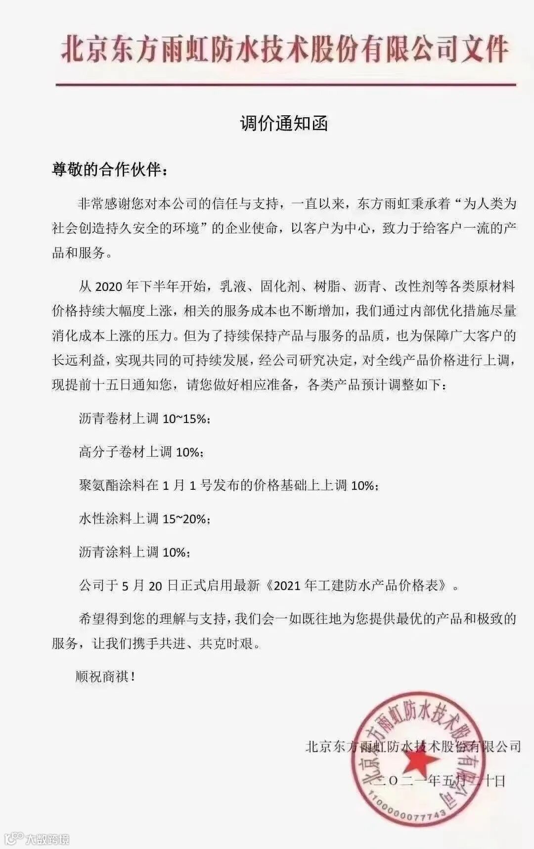 北京东方雨虹防水技术股份有限公司:经研究决定,对全线产品价格进行上调,现提前十五日通知客户,请客户做好相应准备,各类产品预计调整如下: