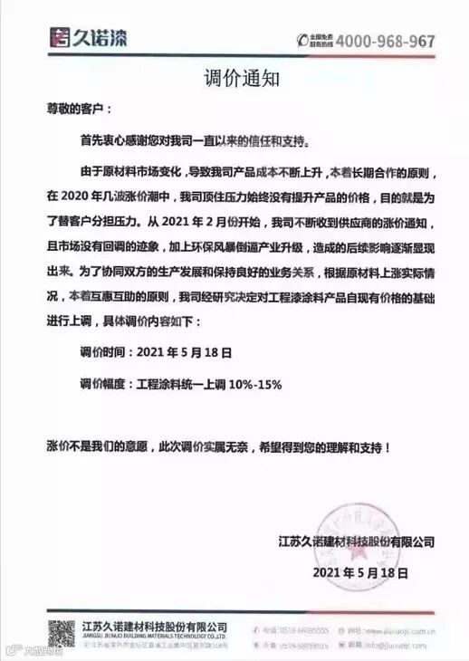 江苏久诺建材科技股份有限公司:5月18日起,工程涂料统一上调10%-15%。